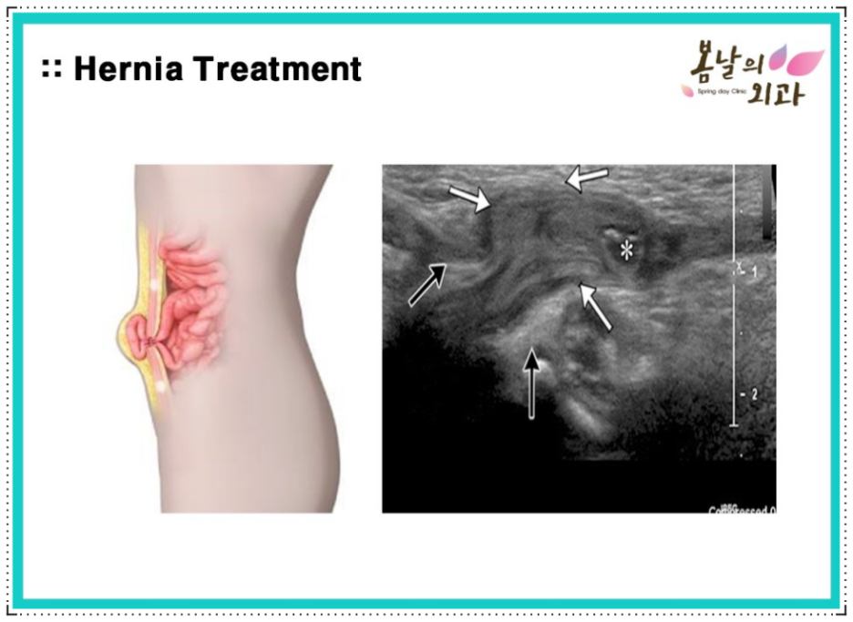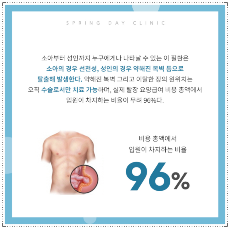 이처럼 탈출한 창자가 구멍에 걸려 장폐색과 장괴사 등의 합병증을 일으킬 수 있기 때문에 조기에 치료해야 합니다. 특히 탈장은 신체의 구조적 문제가 원인이기 때문에 거의 자연치유를 할 수 없고 약물치료도 어렵습니다.즉, 통증이 없어도 서혜부탈장 수술 치료가 유일한 것입니다.