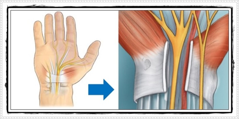 이 질환은 손목에서 손에 잡히는 부위에 뼈와 인대로 둘러싸여 있는 수근관(손목터널) 내부의 신경이 붓는 질환으로 수근관 안에는 힘줄과 신경 등 10개의 구조물이 밀집하여 일부가 조금만 붓더라도 상대적으로 약한 신경이 눌리는 질환입니다.