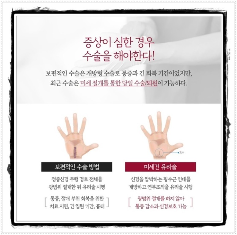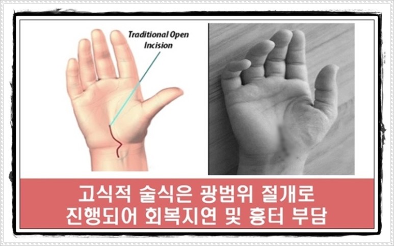 방법은 종이로 잘리는 것보다 작은 1cm 내외의 절개로 수근관터널을 압박하는 횡수근 인대를 유리하게 하고 통증과 절개부위 회복, 감염예방을 위한 치료지연 문제가 줄어들어 빠른 회복이 가능하게 되었습니다.