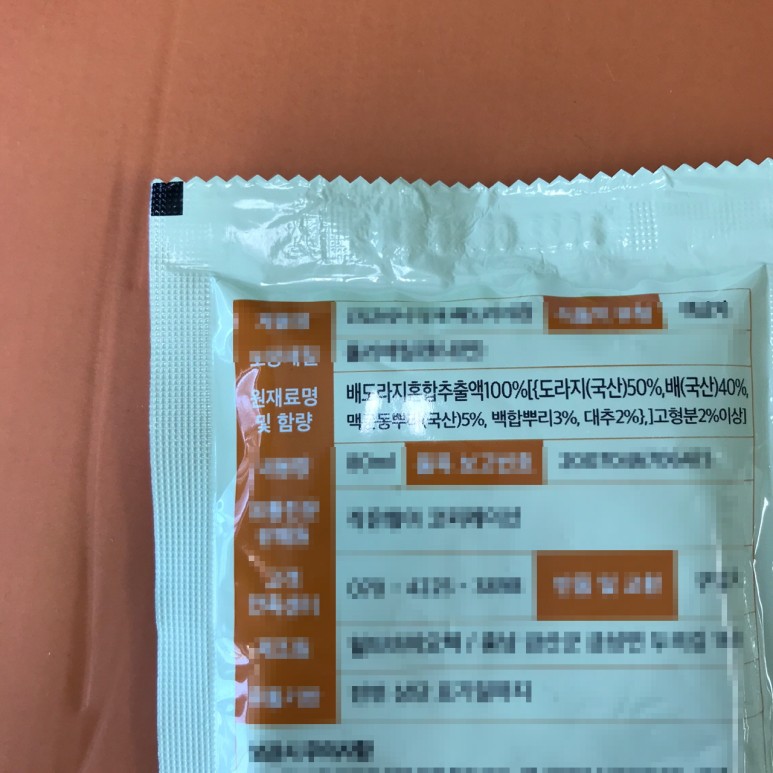 [자연이 담긴 배 도라지즙]과 염증을 제거해 주는 소염작용이 뛰어나 국내산 도라지가 50%, 수분공급, 감기예방에 뛰어난 배가 40% 함유된 음식이었습니다.
