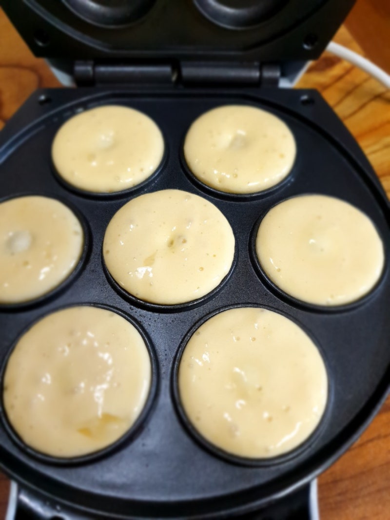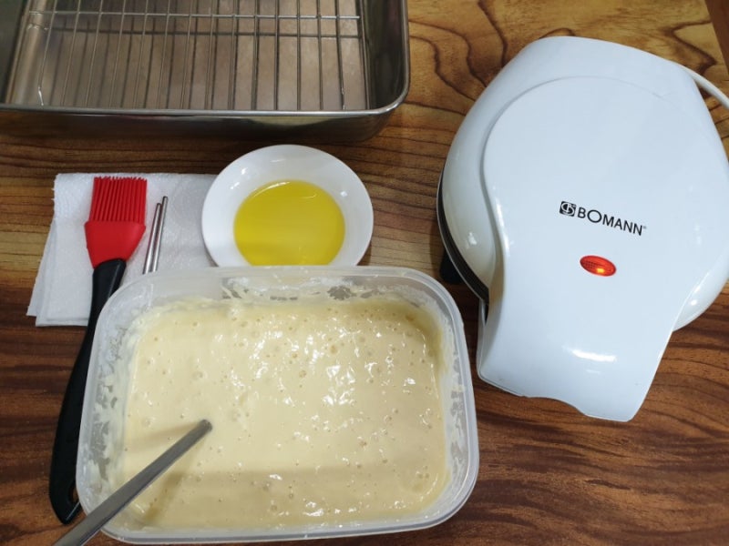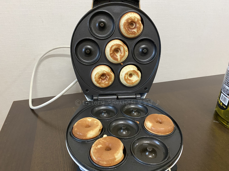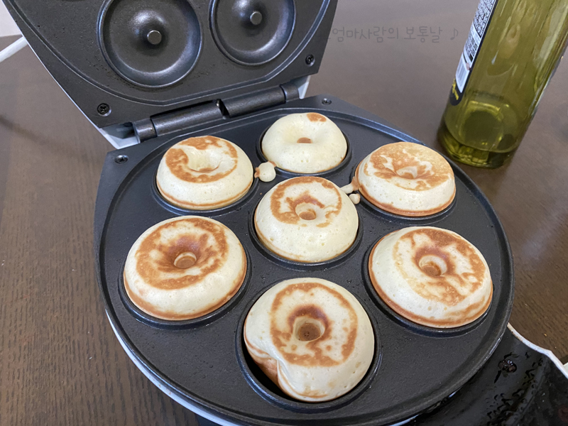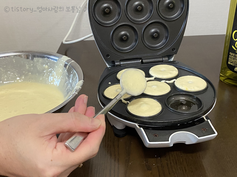 반죽과 함께 도넛메이커 예열~올리브오일을 바르고 숟가락으로 조금씩 넣었습니다.