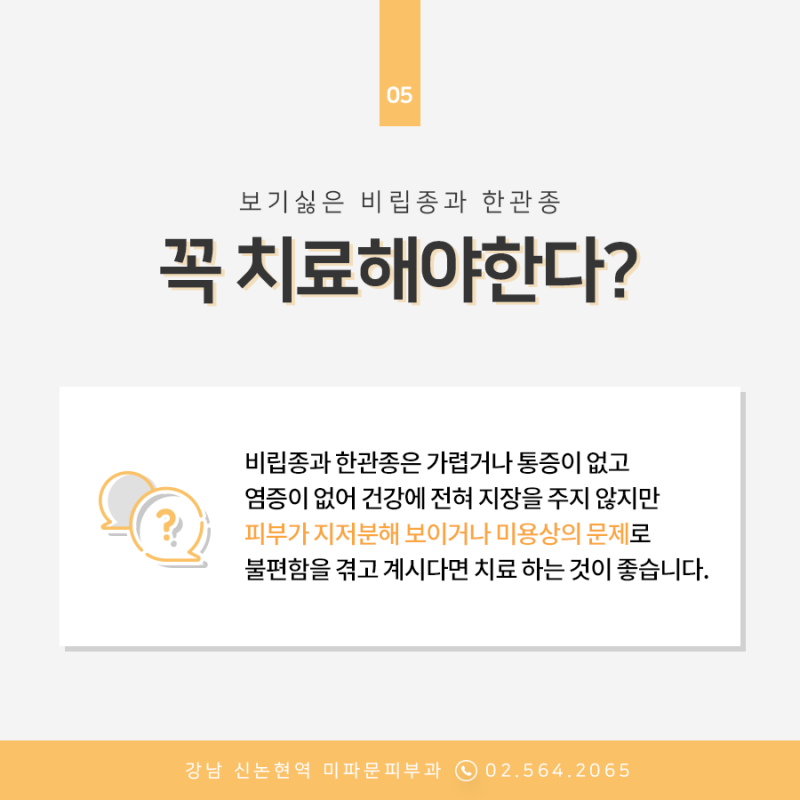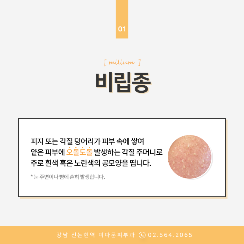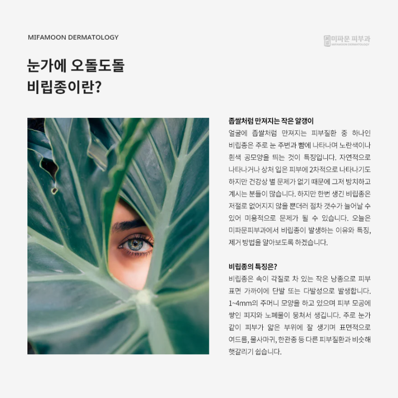 한관종이 발병하는 원인은 유전적 요인이 가장 대표적이며 사춘기 이후 일반적으로 30~40대 여성에게서 발생하며 나이가 들면서 점점 많아지는 양성종양입니다. 조직적으로 피부 깊은 곳에 있고 주변이 섬유화되어 있어 경계가 불분명하며 여러 덩어리로 존재하기 때문에 제거하는 과정이 다소 까다로운 편에 속하는 난도 높은 치료입니다.비립종은 조종이라고도 불리는 질환으로 피지 배출이 잘 되지 않아 모공에 피지가 쌓여 생기는 작은 표재성 각질낭종입니다. 노란색의 작은 쌀알 같은 봉지 안에 각질이 가득 찬 형태를 보이는 각화낭종으로 둥근 구진이 뺨이나 눈꺼풀 등에서 주로 발생하며 좁쌀 여드름으로 착각하는 경우가 많습니다.