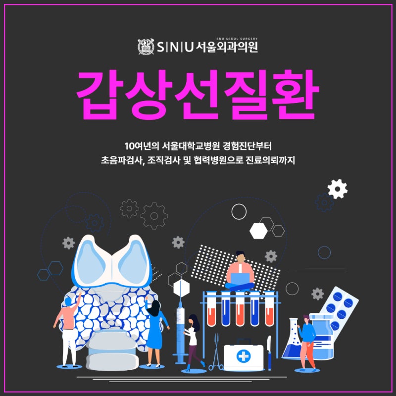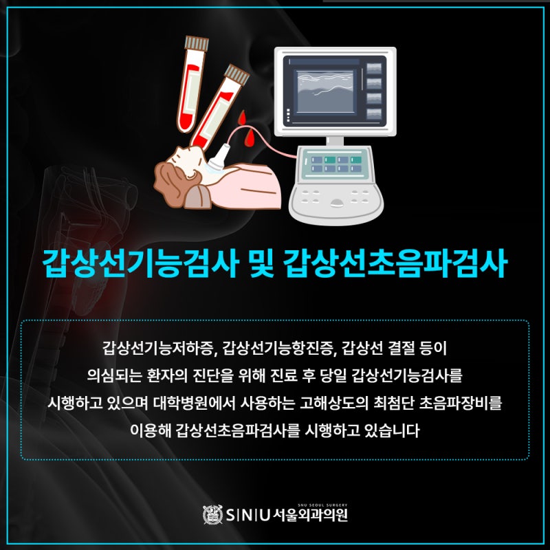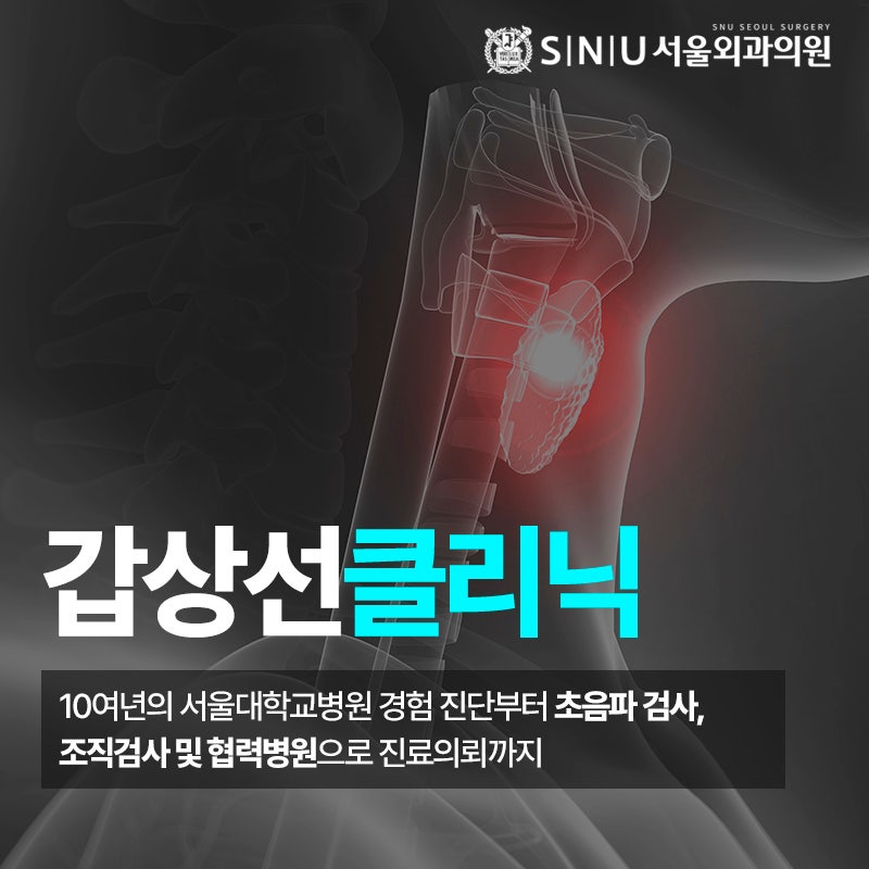 갑상선에 결절이 생겨 갑상선암이 의심되는 경우 정확한 진단을 위해 여러 검사를 실시합니다. 강동구외과 SNU서울외과의원에서는 갑상선기능검사와 초음파검사를 통해 갑상선질환에 대해 파악하고 갑상선암이 의심되는 경우 갑상선조직검사를 통해 그 여부를 파악하게 됩니다.
