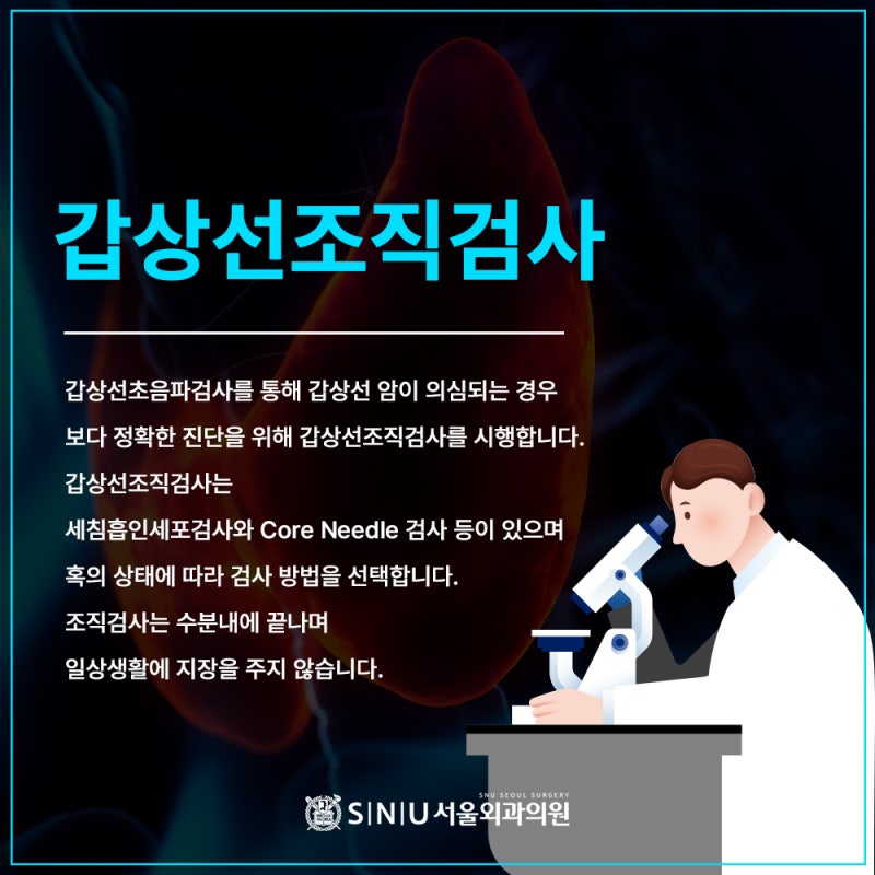 갑상선 조직검사의 두 검사 모두 검사 시간이 짧고 일상생활에 영향을 주지 않기 때문에 부담없이 갑상선암 검사를 받을 수 있습니다. 따라서 갑상선 쪽 혹이 만져지거나 갑상선 질환이 있는 경우에는 빨리 강동구외과 SNU서울외과의원에서 갑상선암 검사를 받고 암이 발견되면 초기에 치료받는 것이 좋습니다.