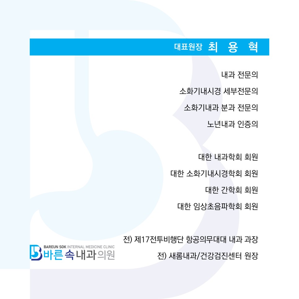 [율량동내과 바른속내과 진료과목] 소화기내과, 내분비내과, 순환기내과, 신장내과, 호흡기내과, 알레르기내과