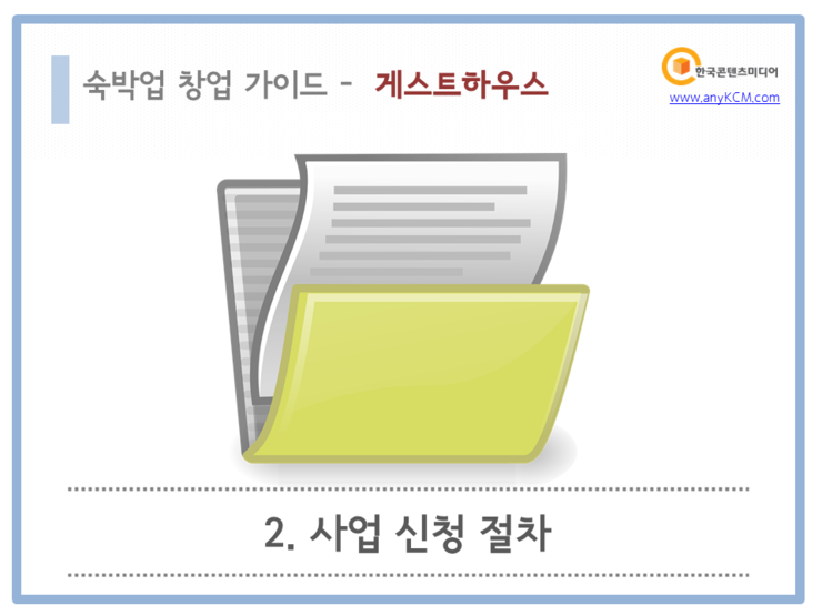건물 계약서 원본:특약 사항에 반드시”본 건물을 게스트 하우스로 사용하도록 동의한다”라는 임대인 동의에 대한 문구가 기재되어 있어야 한다.전입 신고:계약한 건물 계약서와 주민 등록증을 지참한 뒤 해당 관할 주민 센터에 방문하고 전입 신고를 내고 주민 등록증이나 주소 갱신해야겠어요. 그 뒤 등본 1통 발행하고 꼭 확인하세요. 또 보증금의 안전을 위해서 반드시 확정 기일을 받는 것을 권장합니다.시설 배치도 or설계도:전문가 그래도 파일 도면이 아니더라도 직접 도면에서 그릴까, 회판 등을 이용하여 약식으로 그리는 것도 있습니다.사업 계획서:별로 정해진 양식은 없습니다. 워드에서 A4용지 1장 정도의 분량에 내가 이 게스트 하우스를 어떻게 운영하는가 하는 계획을 자유롭게 기입하세요.(사업 개요, 시설 개요, 영업 계획, 고객 관리 계획 목표 수익 등)기본 증명서:이는 구청에 갈 때에 민원실에 들러서 발행하세요. 주민 등록증만 있으면 당장 발행됩니다.