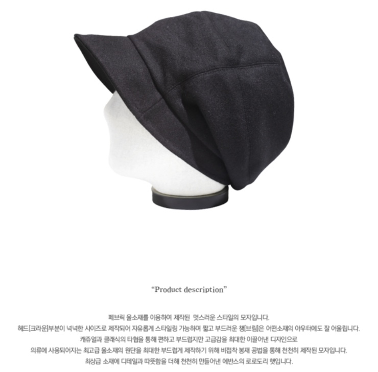 로로드리 모직 해트 블랙 특징 (Lo Lodori woolhat black) – 패브릭 울 소재를 이용하여 제작된 멋스러운 스타일 – 헤드(크라운) 부분이 넉넉한 사이즈로 제작되어 자유롭게 스타일링 가능하며 짧고 부드러운 챙(챙)은 어떤 소재의 아우터에도 잘 어울린다 – 캐주얼과 클래식한 타협을 통해 편안하고 부드럽지만 고급스러움을 최대한 끌어낸 디자인 – 의류에 사용되는 최고급 울 소재의 아우터에도 잘 어울린다 – 원단으로 제작됨