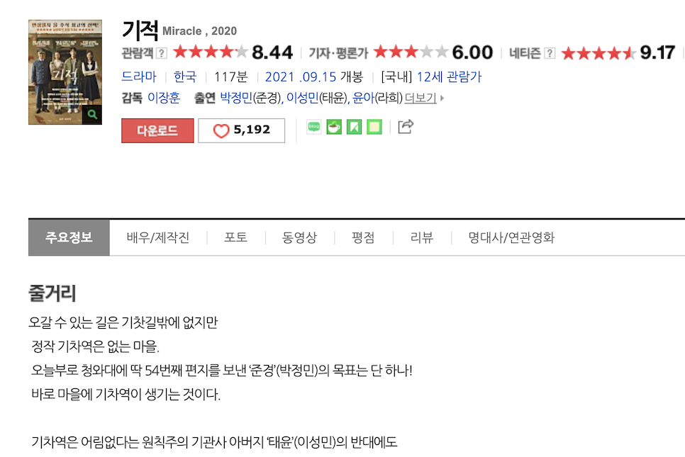 영화 기적의 평점은 네이버 기준으로 관람객 8.44점, 기자 평론가 6.00점, 누리꾼은 9.17점을 기록하고 있다. ●인터넷 이용자 점수 9점 넘는 게 인상적