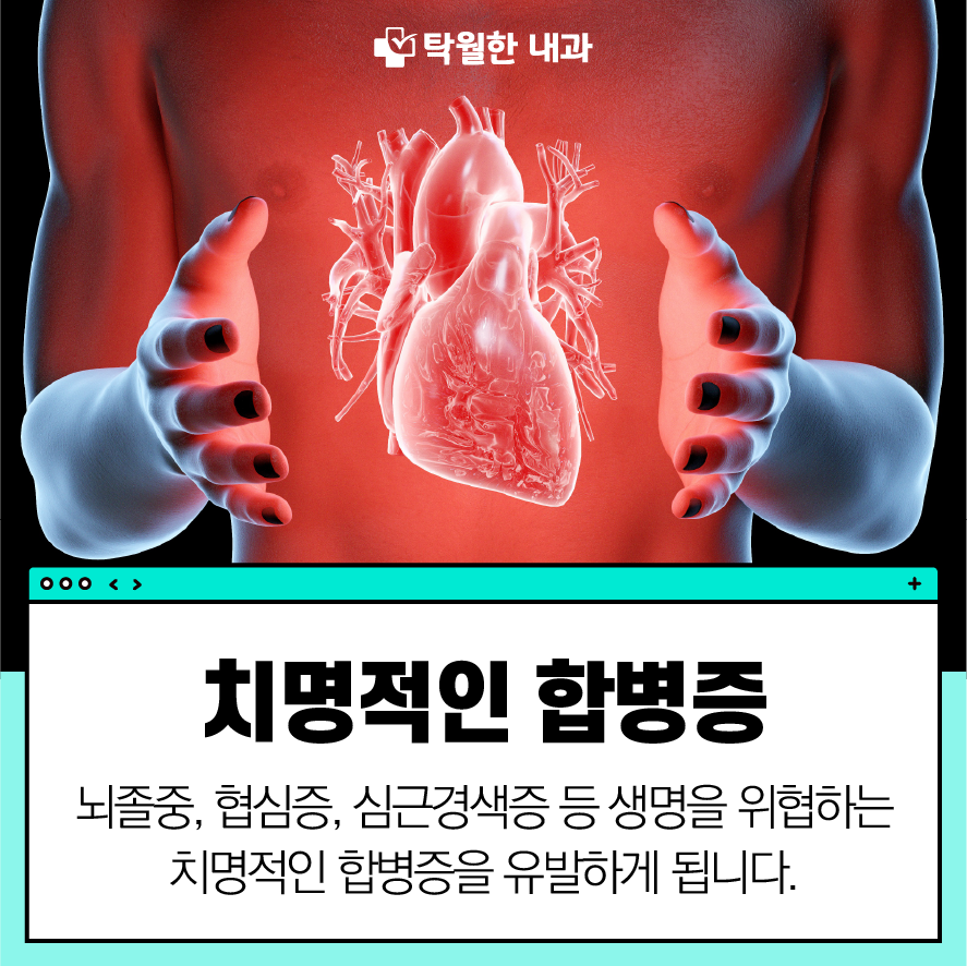 치명적인 합병증=뇌졸중, 협심증, 심근경색증, 심부전, 신부전, 고혈압성 망막증 등 생명을 위협하는 치명적인 합병증을 유발하는 고혈압은 조기에 진단하고 관리해야 합니다.