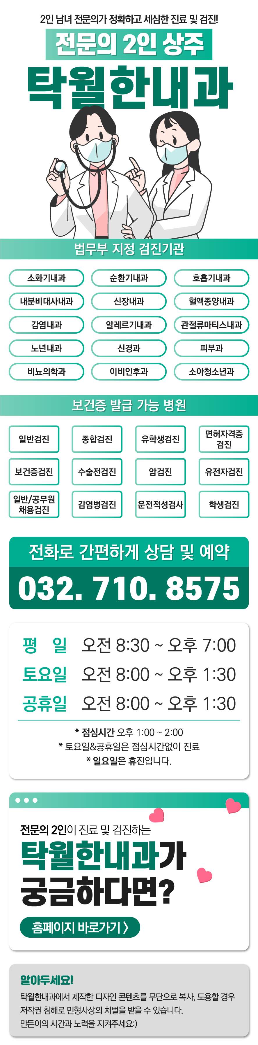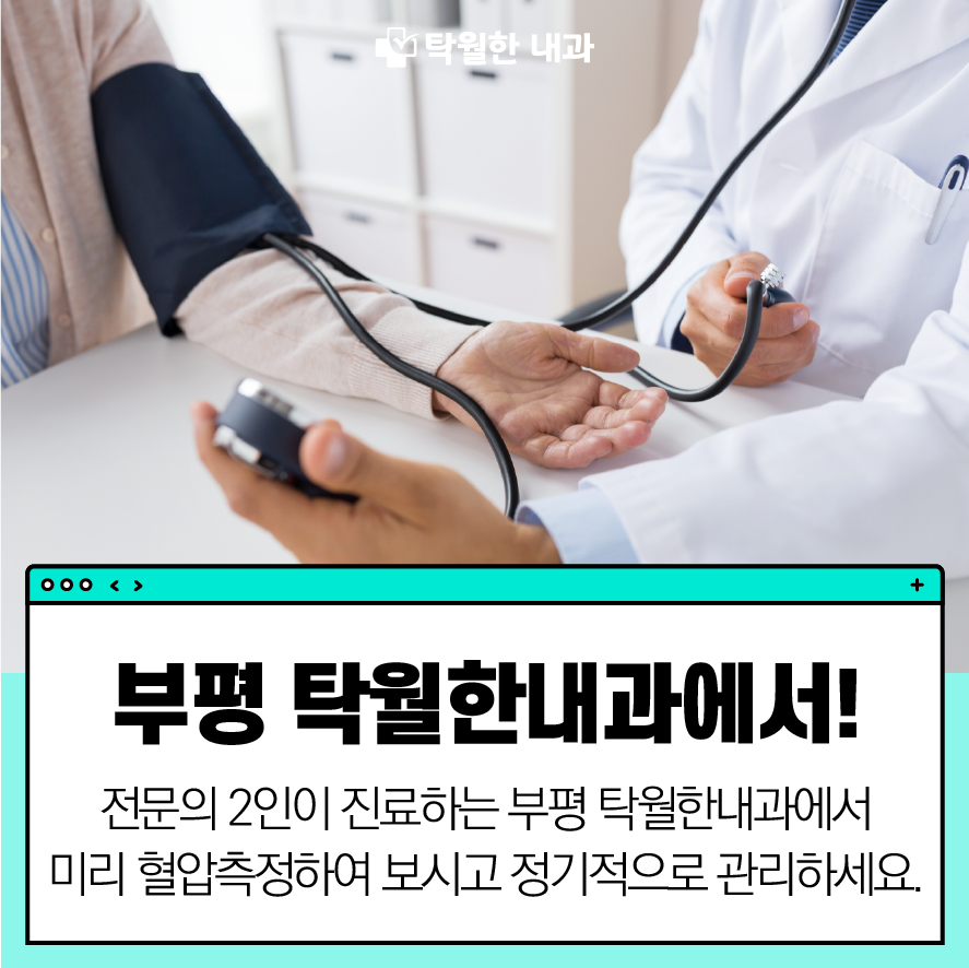 부평탁월한내과에서!대학병원 출신 전문의 2명이 진료하는 부평 탁월한 내과에서 미리 혈압을 측정해 보고 정기적으로 관리해 주세요. 고혈압은 증상이 없기 때문에 혈압을 측정하지 않으면 발병 유무를 확인할 수 없습니다. 잊지 마세요!