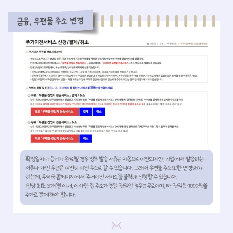 공과금 정산 외에도 이사 전후 우편물 주소 이전을 꼭 신청해 주시기 바랍니다.우편물 주소 이전 서비스 신청 한 번에 금융기관, 이동통신, 백화점 등 모든 우편 연락을 이사하는 자택 주소로 변경할 수 있습니다.