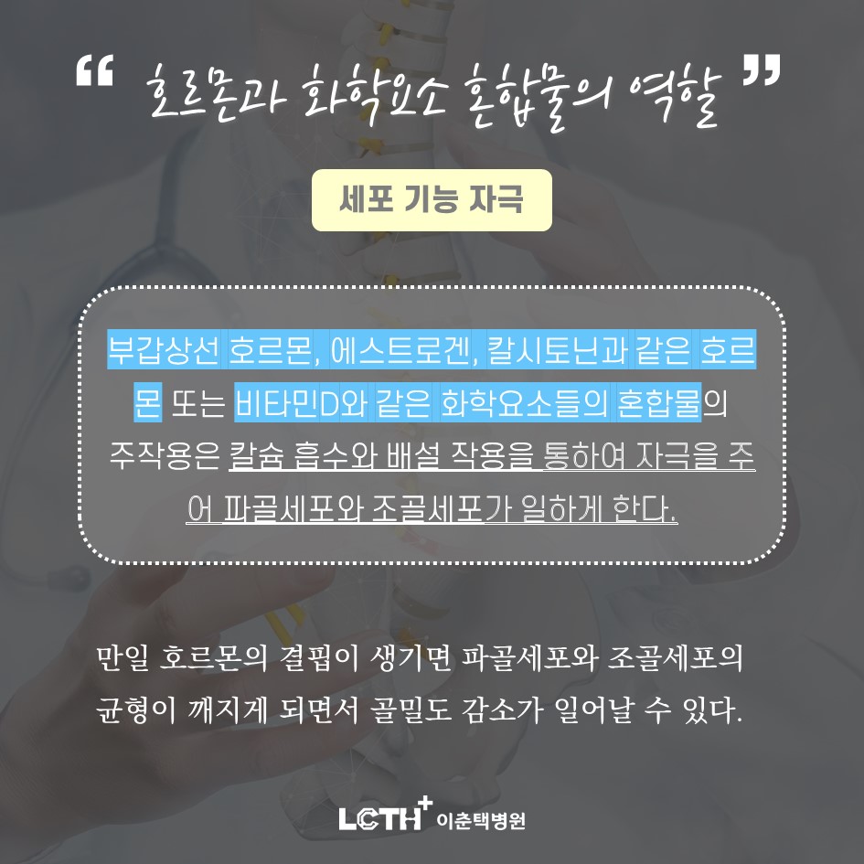뼈의 재형성에 있어서 주요 파골세포와 조골세포는 호르몬이나 화학요소의 혼합물에 의해 균형을 이루고 있습니다. 그 작용에 관여하는 대표적인 호르몬은 부갑상선 호르몬, 에스트로겐, 칼시토닌 등이 있으며, 혼합물로는 비타민 D가 있습니다. 이러한 역할은 칼슘 흡수와 배설작용을 통해 혈액 속의 칼슘 농도를 조절하고 파골세포와 조골세포의 기능을 자극합니다.폐경 여성 갑상샘암 수술 후 골다공증