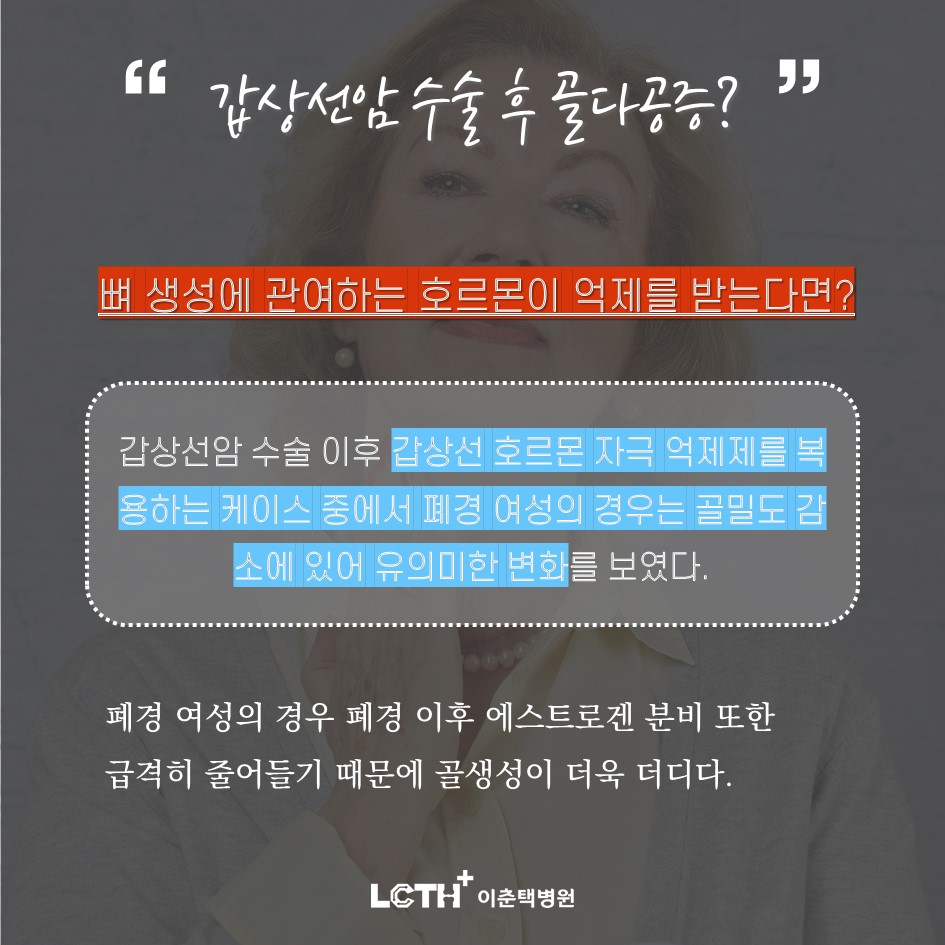 오늘 수원성형외과 이춘택병원과 함께 갑상선암과 골다공증의 상관관계에 대해 알아보았습니다. 골다공증은 예고없이 찾아오는 도둑과 같아요. 외상으로 인해 쉽게 골절되어 버린 후에 깨닫는 일도 드물지 않습니다만. 특히 폐경이 된 여성의 경우라면 지금 이춘택 병원의 전문의와 상담하여 골다공증을 예방 관리하는 것이 좋습니다.