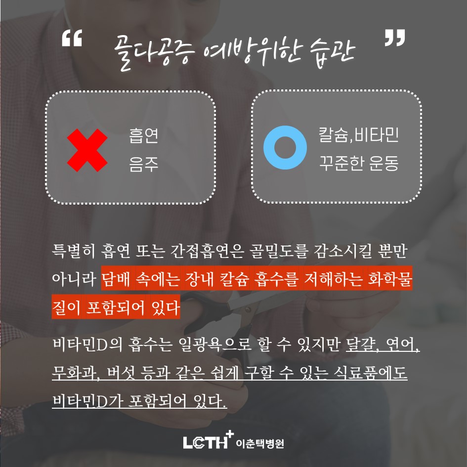 우선 해서는 안 될 일과 손은 흡연과 음주를 자제하는 건데요. 흡연 또는 간접흡연은 골밀도를 감소시키고 담배에는 장에서 칼슘을 흡수하는 화학물질이 함유되어 있으므로 골다공증 예방을 위해 금연을 하는 것이 가장 좋습니다.