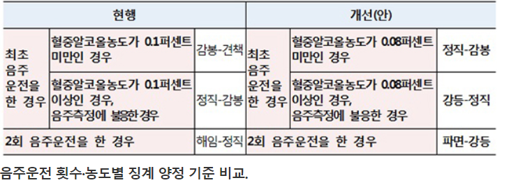 윤창호법으로 법정형이 개정되기 이전에는 가벼운 접촉사고를 내거나 단순 음주운전으로 2~3회 적발돼도 벌금 선처가 가능했지만, 지난해인 2021년 12월 30일 공무원 징계기준 개정으로 경찰 단속 시 불응하거나 0.2% 이상의 혈중알코올농도 만취 수치로 도로교통법 위반 단속이 되면 초범이라도 중징계가 가능하도록 개정됐다고 합니다.