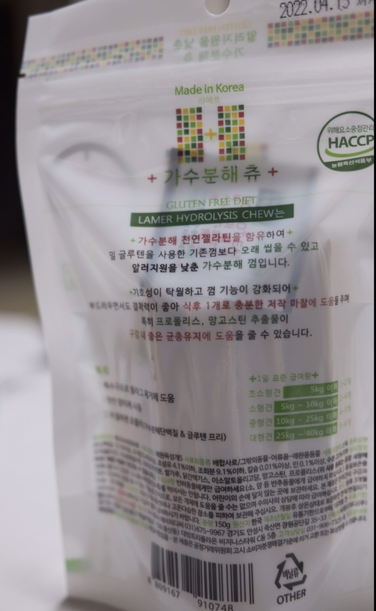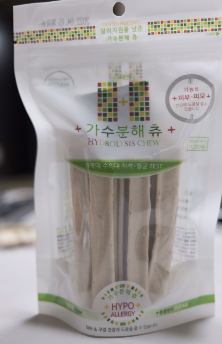 동물병원에서 구입할 수 있는 개의 구강케어용 껌인 가수분해츄는 이름 그대로 단백질을 가수분해 처리하여 알레르기 지원을 줄여 피부가 민감한 어린이에게도 안심하고 줄 수 있습니다.