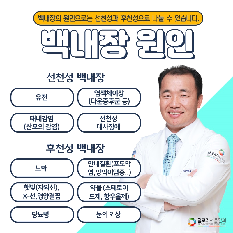 백내장의 이유는 크게 선천적인 원인과 후천적인 원인으로 나눌 수 있습니다.주요 발병원인인 노화는 후천적 요인에 해당되며 이외에도 안구외상이나 당뇨, 안구질환, 자외선 등이 포함됩니다.선천적인 요인으로는 태내 감염이나 선천성 대사장애 등이 있으며, 특히 가족력이 있는 경우에는 발병률이 높아질 수 있으며, 1년에 1~2회 안과를 방문하여 눈을 진단하는 것이 좋습니다.백내장이 발생하면, 원거리 시력의 저하와 함께, 사물이 이중으로 겹쳐 보이는 증상이나, 사물의 색을 구별하기 어려운 증상, 빛의 번짐이 심해서 햇빛 아래에서 눈을 뜨기 어렵고, 가로등이나 차의 헤드라이트가 퍼지는 증상 등, 평상시에는 볼 수 없는 증상이 나타나게 됩니다.갑자기 근거리시력이 좋아지는 증상도 백내장 증상으로, 이러한 증상은 말기 증상에 해당하는 만큼 즉시 내원해야 합니다.