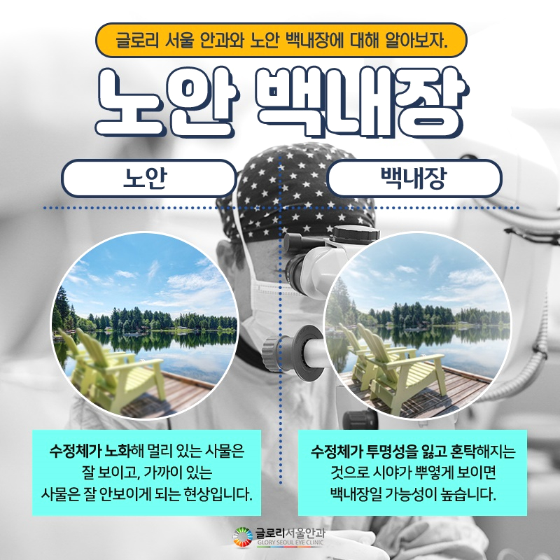 노화로 인해 일어나는 대표적인 질환으로 백내장이나 노안이 있습니다.둘 다 수정체의 문제가 시력 문제를 일으킨다는 점에서 공통적으로 시야가 전체적으로 희미하게 보이는 초기 증상이 비슷해 직접 구별하기가 쉽지 않습니다. 단, 백내장은 노안과 달리 여러 가지 원인에 의하여 발생할 수 있을 뿐만 아니라 자칫 합병증이나 실명까지 유발할 수 있으므로 가급적 조기에 증상을 발견하여 적극적으로 개선하는 것이 좋습니다. 백내장이란 투명성을 유지하고 있는 수정체가 탁해져 눈앞이 흐릿하게 보이는 질환입니다. 노년층만의 질환이라는 인식과는 달리 최근에는 백내장에 노출되는 연령이 점점 낮아지고 있는 상황이기 때문에 백내장에 생기는 이유와 구체적인 증상을 미리 숙지하는 것이 좋습니다.