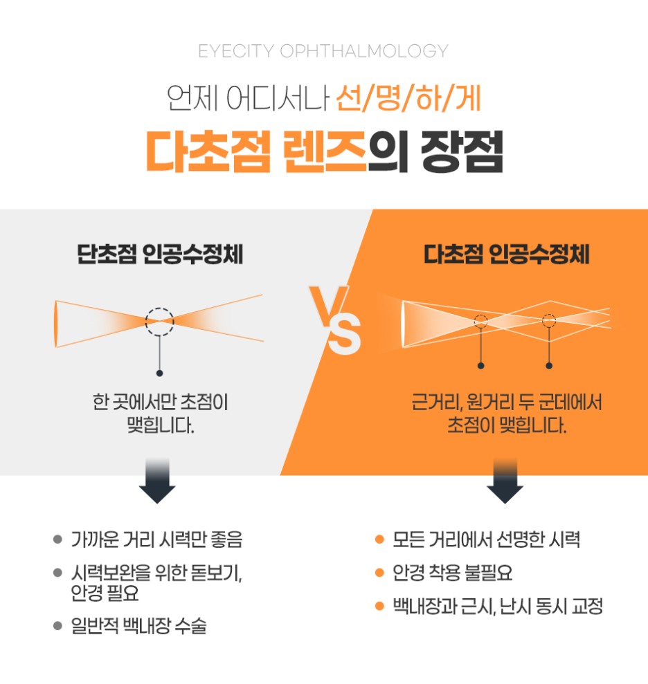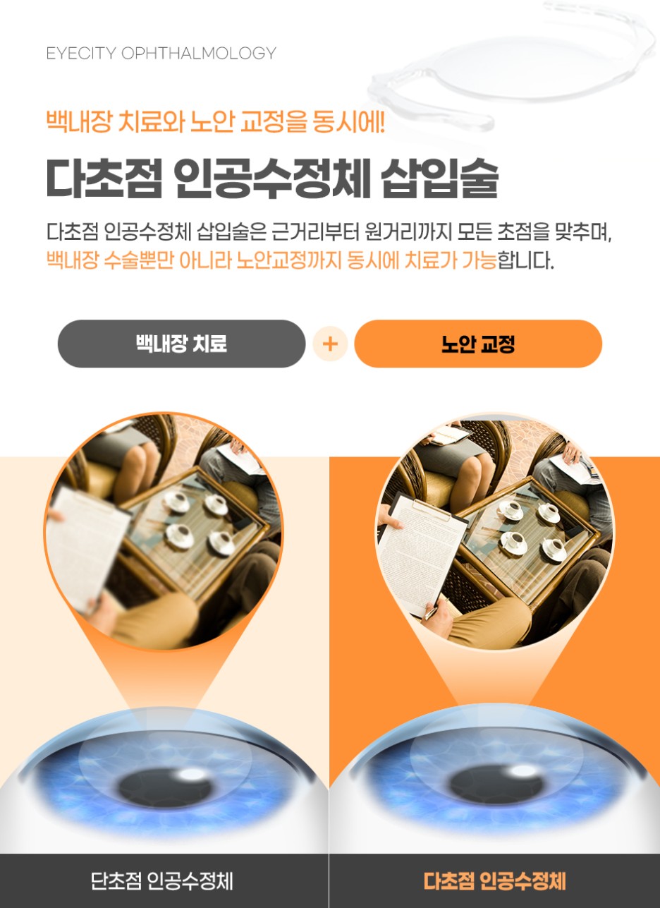 백내장 교정을 위해 인공수정체 삽입이 단계별로 실시됩니다.다만초점,다조치로분류되어분명한차이를알수있었습니다. 단초점 인공수정체는 눈에 들어오는 빛을 원거리, 근거리 중 한 곳에만 보낼 수 있었습니다. 초점이 맞지 않는 부분을 볼 때는 안경, 돋보기 착용을 해야 했어요.