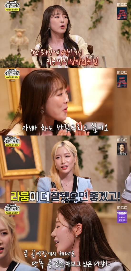 조현아는 “골프클럽을 바꾸고 싶다”며 “라붐이 더 잘 되길 바란다. 팀원 모두가 잘됐으면 좋겠다는 서연의 소원에 “편집해달라”고 말해 웃음을 자아냈다.유일하게 버튼을 누르지 않았던 윤은혜는 갑자기 눈물을 흘렸는데요. 윤은혜는 “멤버들의 소원을 들어보니 눈물이 났다”며 “WSG워너비를 통해 모두가 잘 되고 더 사랑받고 더 많이 누리고 행복한 시간이 됐으면 좋겠다”고 진심을 전했다.