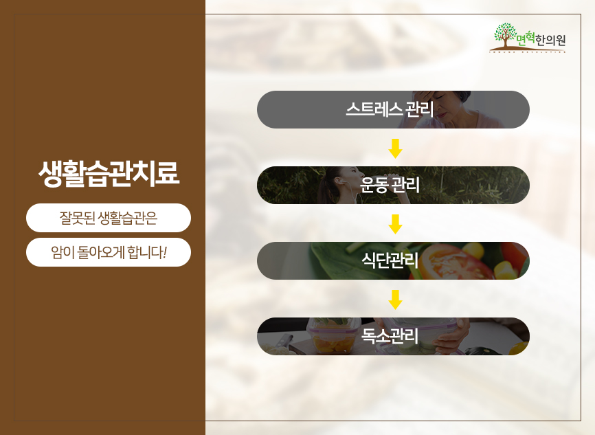 따라서 본원에서는 스트레스관리, 운동관리, 식단관리, 독소관리 등의 생활습관치료를 통해 면역력과 갑상선암의 완치율을 높이고 있습니다.