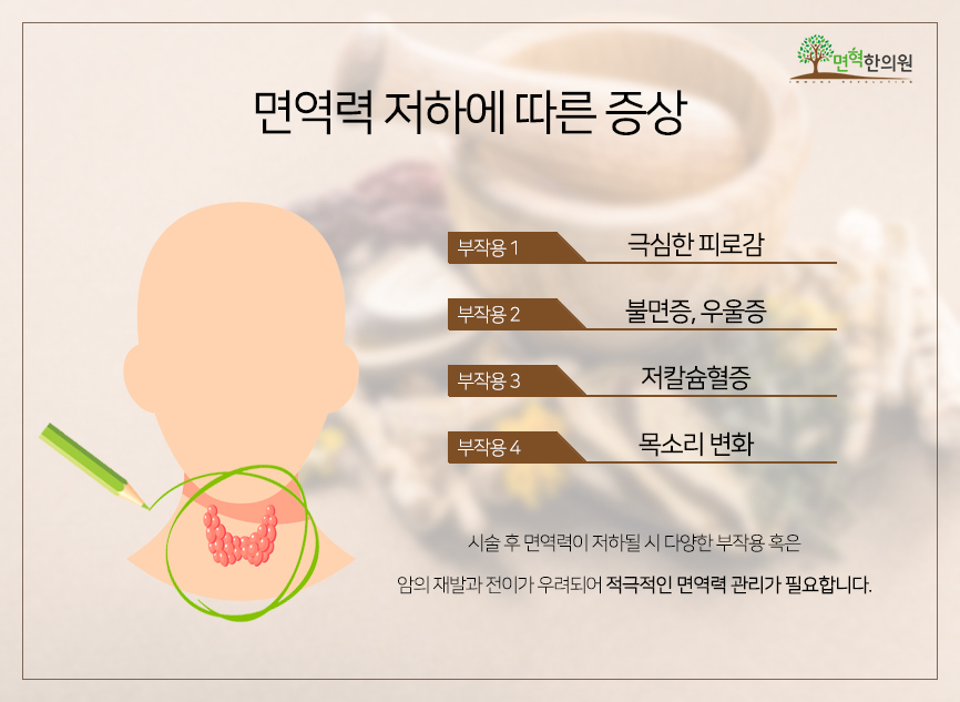 이후 극도의 피로감, 저칼슘혈증, 목소리의 변화, 불면증이나 우울증 등의 후유증을 유발할 수 있습니다. 면역력이 회복돼야 빠른 암 회복에 도움이 되기 때문에 적극적인 면역력 관리가 중요합니다.