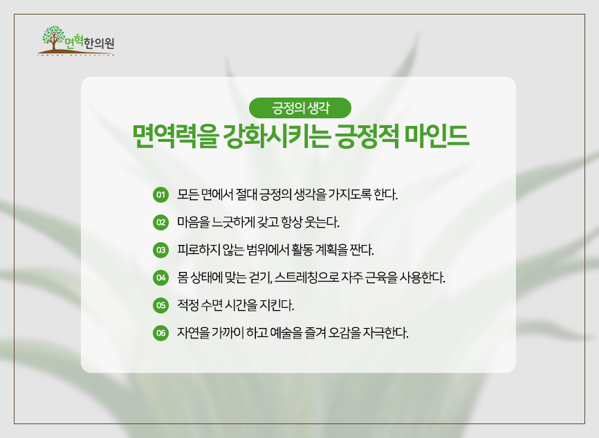 평소 긍정적인 마음가짐, 적당한 운동, 수면시간 유지, 자연친화 등은 모두 떨어진 면역력을 높이는 데 도움이 됩니다.