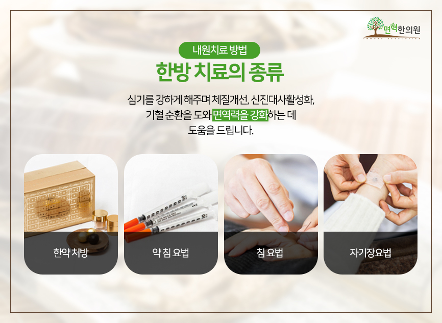 “수성시장역 한의원, 면혁한의원에서는 한약처방, 약침요법, 체침요법, 자장요법 등의 한방치료를 통해 면역력과 암 호전속도를 높이고 있습니다”