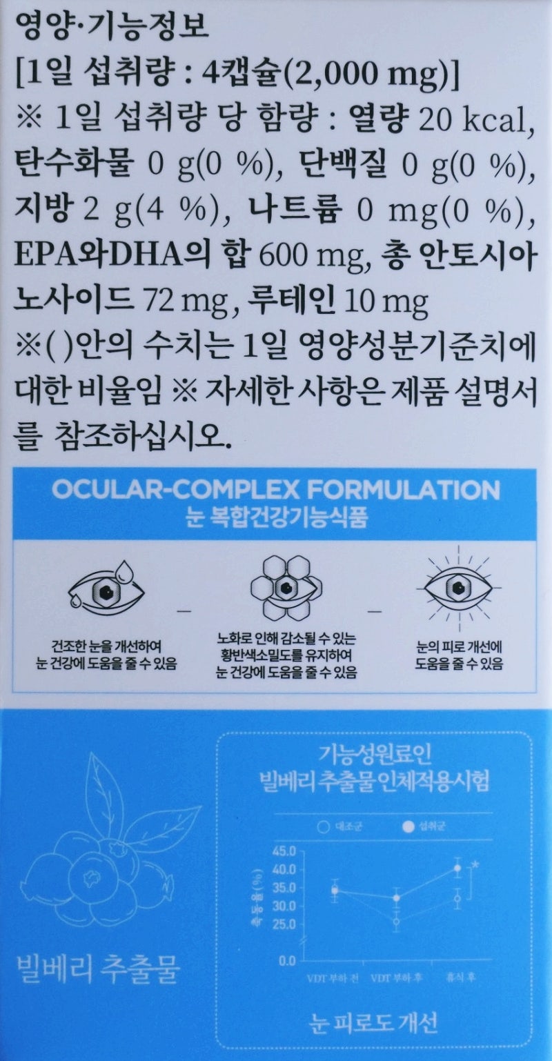 패키지 상자 아래 메리골드 꽃 추출물과 빌베리 추출물이 보이시나요?오큘러레이드는 눈에 좋은 영양제를 만들기 위해 오메가3, 빌베리추출물, 메리골드꽃추출물(루테인)까지 모두 함유되어 있는 빌멜원료라고 합니다!!! 오메가3는 눈의 건조함을 줄이는 데 도움이 되는 원료입니다.빌베리 추출물은 눈의 피로를 덜어주는 원료입니다.메리골드 꽃 추출물은 눈 노화 예방에 도움이 됩니다!