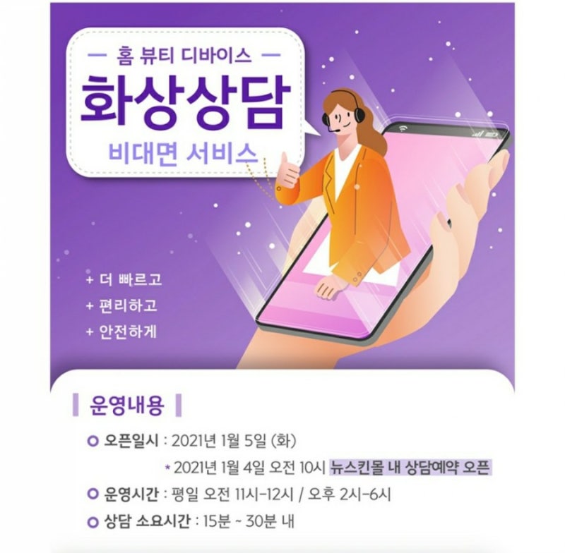 예약 확인이 되면 예약 날 예약 시간에 본사에서 전화로 예약 확인 후에 화상 링크를 보내시면 휴대 전화에 화상 연결이 생겨나고 그 때 고장 난 디바이스 뉴ー스킨갈바닛크과 루미 스파, 부스트 등을 작동하면서 못하는 부분을 본사 직원을 확인할 수 있게 보이세요!그리고 구매 기간에 따라서 1년 미만은 무상으로, 그 다음은 유상으로 새 제품으로 교환하는 것을 확인한 후 배송원이 연락하고 기존의 디바이스를 회수하고 신제품은 택배로 받게 됩니다~!(교환이 없어~!)기간은 접수 후 2~3일 정도 걸린다고 생각하세요!