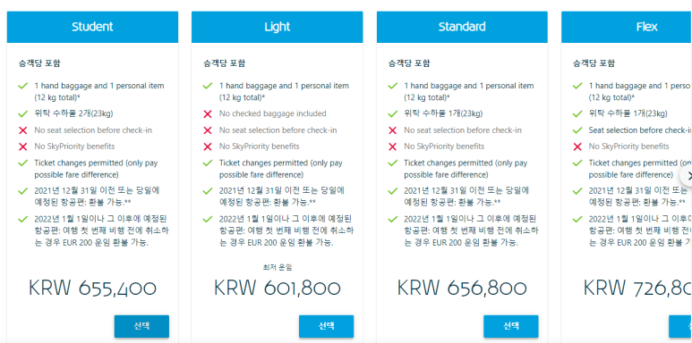 예약시 승객 인원수를 고를 때 나이도 고를 수 있는데 그때 학생연령을 고르면 학생요금이 나왔기 때문에 일반요금보다 당연히 저렴할 것이라고 생각했다. 그래서 나는 student(655,400원) 티켓을 예매했는데