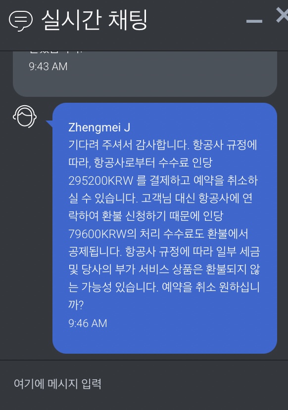 비행기 편도티켓(인천-이스탄불-맨체스터) 가격이 약 45만원 이었는데 수수료를 374,800원이나 내셔야 했습니다.(취소시 대행사에서도 수수료를 내셔야 하기 때문에 가능하면 항공사 direct에서 예약해 주세요.)ㅠㅠ