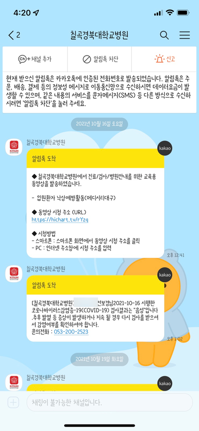 응급실 도착 집 근처에 있는 병원이 경북대병원이어서 그곳으로 갔다.응급실 가서 바로 체했다기에 혹시나 해서 소변검사, 피검사도 했는데 바로 몸 상태를 파악할 수 없어 ㅠㅠ기대가서 CT 검사를 하자는 소견을 받았다.그래서 CT촬영을 하러 검사실로 갔다 생애 첫 검사라 조금 긴장했지만 찍어보니 별거 아니었고 링거를 맞아 겨우 눈을 떴다가 깨우기를 반복하자 담당 의사 선생님이 와서 긴급 수술을 해야 한다며 입원 수속을 하라고 했다.봐.. 내가 스.. 수술이라니 ㅠㅠ 입원하기 전 코로나 검사가 필요해서 나와 남편은 사이좋게 코로나 검사를 했다.. 게다가 나는 누워서 코를 두번이나 찔렸다.. 태어나서 처음 보는 코로나 검사였는데 다시 떠올리고 싶지 않은 기억이네.^^ 독감 검사할 때도 비슷했던 것 같은데.. 독감 검사 때보다 더 아팠던 기억이다.