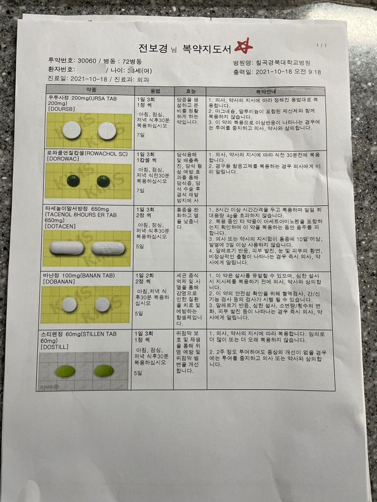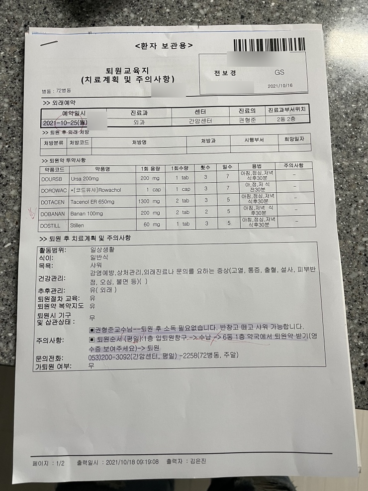 비용은 180만원 정도였다.물론 보험 적용했을 때 가격으로 실제 비용은 내 생각 이상으로, 의료보험 만세ㅠㅠ)병원에 따라 차이가 있겠지만 내가 입원했던 칠곡경북대병원은 그랬다.이것은 병원에 따라 다르기 때문에 참고해 주시면 좋을 것 같습니다.퇴원 안내서를 받으면서 약 설명도 같이 받았다.(tmi. 약은 한달정도 먹었지만 루아콜이라는 나는 약… 겁이 나서 먹기 힘들었다ㅠㅠ)