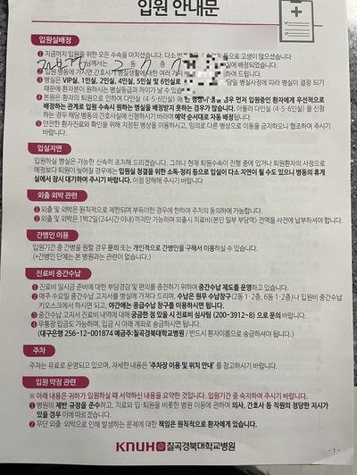 코로나 검사 후 또 몇 시간이 지났지?(카톡 기록을 보면 그렇게 오랜 시간이 아니었네.) 모스크타드 ^^ 자다가 깨다 보니 시간 감각이 없어진 지 오래야. 간호사를 불러 그늘에서 입원하러 병동에 올라가자고 해서 정신없이 병동에 따라갔다.입원 전 혈압과 키, 몸무게를 재고 간단히 입원 안내문을 받아 내가 입원한 병실로 갔다.병실에 가면 환자복이 준비되어 있어서 겨우 옷을 갈아입고 좀 앉아 있더니 갑자기 수술하러 간다는 거 아니겠어?