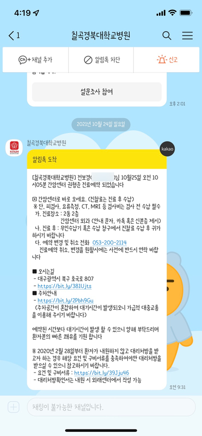 내 상태가 많이 안 좋았던 것 같아. ㅠㅠ이렇게 급하게 수술일정을 잡다니…어쨌든 혼란스러운 상황에서 수술하자고 하니 갈 수 밖에 없다.