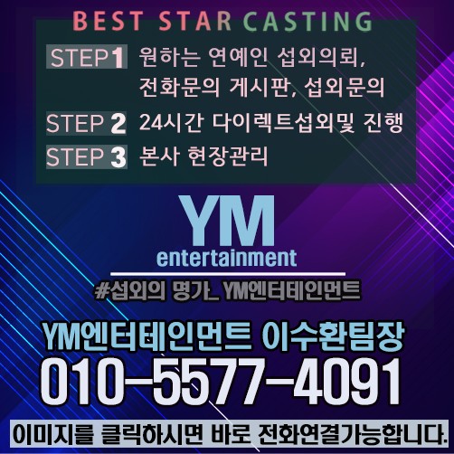가창력 있고 퍼포먼스까지 듣는 재미와 감동 보는 재미까지 겸비한 가수입니다^^ 들으면 마음이 정화되는 노래, 이벤트, 분위기 잡는 능력까지 믿고 듣는 검증된 가수 김나희!!개그맨 섭외 고민인가요?그렇다면 김나희! 특히 추천합니다성공적인 이벤트가 될 거예요.~소중한 시간이 될 준비 되셨습니까?저도 도와드릴게요.^^ 연예인 섭외 어렵지 않습니다.저에게 전화 한 통화면 야외완료!! YM엔터테인먼트에서는 빠른 피드백으로 검토하실 수 있습니다.