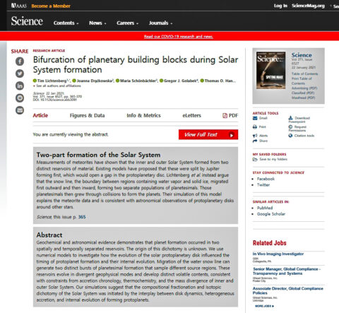과학저널 사이언스에 실린 이 연구에서 연구팀은 지구와 금성, 화성과 같은 태양계 내측 지구형 행성(terrestrial planets)과 목성 토성 천왕성 해왕성과 같은 외부 태양계의 몇 가지 특징과 함께 소행성과 운석류의 구성을 설명할 수 있는 태양계의 형성과 구조에 대한 새로운 이론적 틀로 구성됐다.