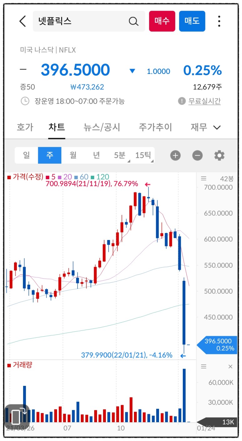 추락 중인 넷플릭스 주가 캡처=삼성증권 엠팝 넷플릭스의 주가가 강세를 보였습니다. 이게 되는 건지…
