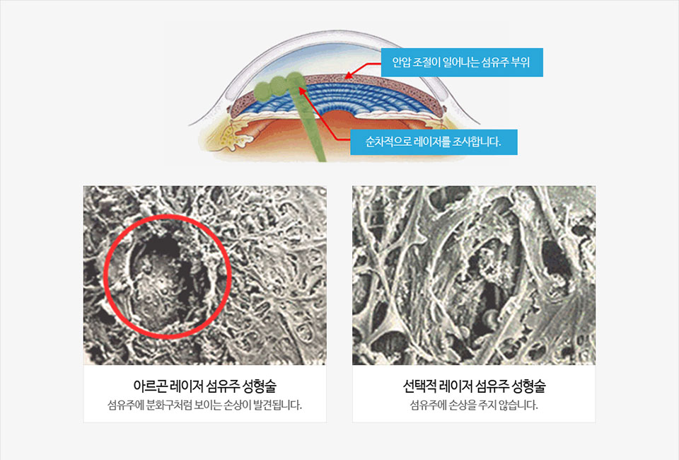본 치료법은 방수 유출에 장애를 유발하는 섬유주 부분에 특정 파장의 레이저를 매우 단기간 조사하여 다른 세포에는 전혀 손상을 주지 않고 문제를 일으킨 세포만 선택적으로 제거하여 안압을 하강시키는 새로운 개념의 최신 녹내장 레이저 치료 방법으로 기존에 사용된 알곤 레이저 섬유주 성형술(ALT)에 비해 동등하거나 다소 뛰어난 효과를 보였으며 시술 후 안압 상승 등의 합병증이 발생할 확률이 낮습니다.SLT 레이저 원리