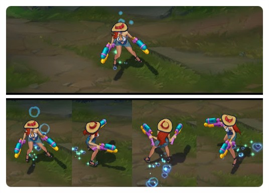 이미지 출처 : 스킨 스포츠 라이트풀 파티 미우라의 Q스킬은 작은 대포알(!?)처럼 꽤 커 보이는 총알이 아니라 물을 날리며 날아가는 비치볼이 발사됩니다.(너무 귀엽네요)웃음