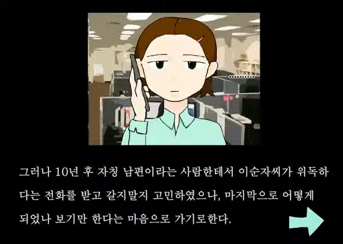 열심히 일을 하다가 갑자기 전화를 받게 되었고, 그 때 자칭 남편이라는 사람으로부터 자신의 어머니가 위독하시다는 말을 듣게 되었다고 합니다. 그렇게 속상해하는 가운데 다시 한번 얼굴을 보러 가야겠다고 결심하게 됐어요.