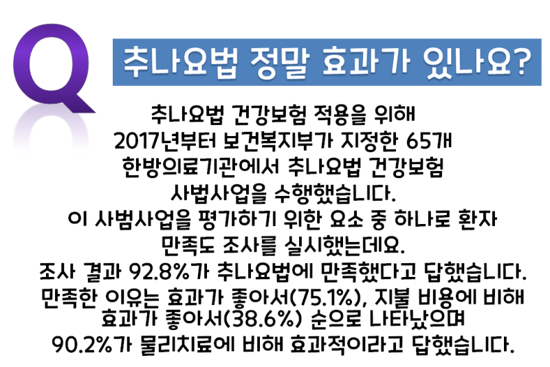 하지만 추나요법은 한의사가 직접 하기 때문에 이런 점에서 다릅니다. 물론 맨손으로 힘을 가해 교정하는 방식은 같지만 다소 다른 점, 그리고 상황과 상태에 맞게 올바르게 교정해야 한다는 점을 고려하여 반드시 정확한 검사를 통해 올바른 신체를 갖추시기 바랍니다.