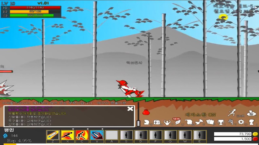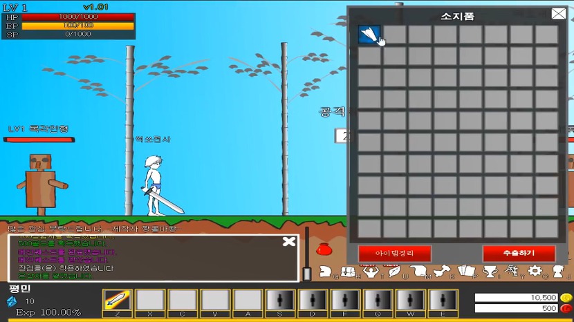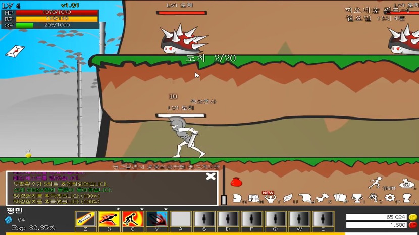 현재 공격력이 낮은 무기와 별 볼일 없는 장비를 착용하고 있는 상태입니다.그래도 사냥터의 몬스터는 전투력이 낮기 때문에 그 장비로도 충분히 쉽게 싸울 수 있습니다.몬스터를 한 마리씩 잡을 때마다 레벨에 비례하여 경험치와 골드가 보상됩니다.