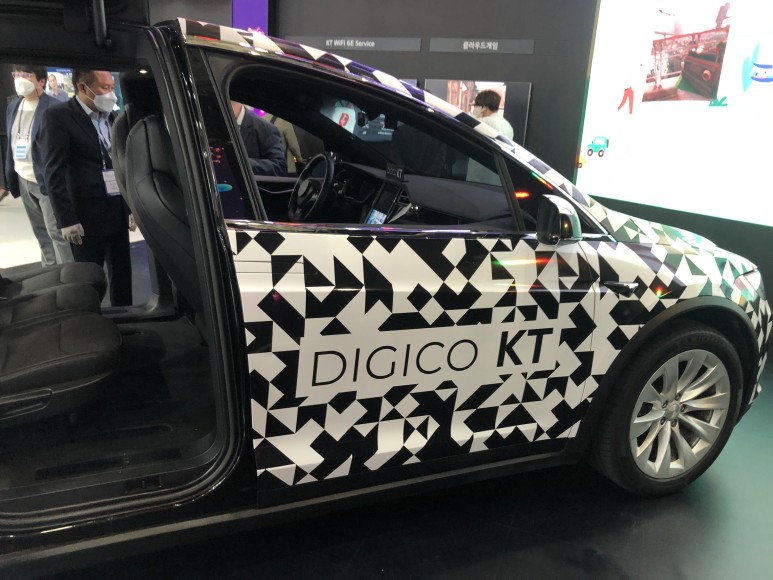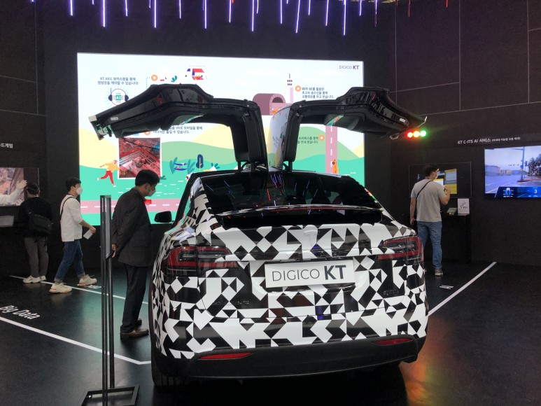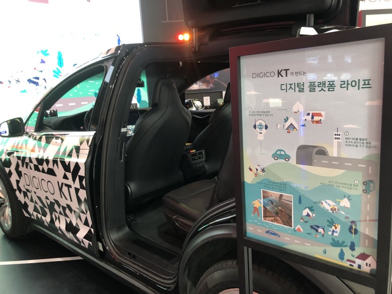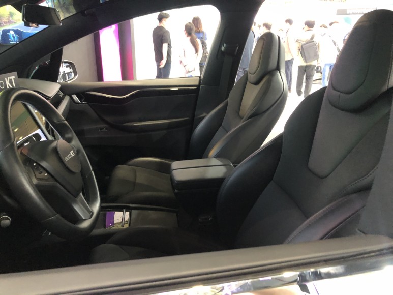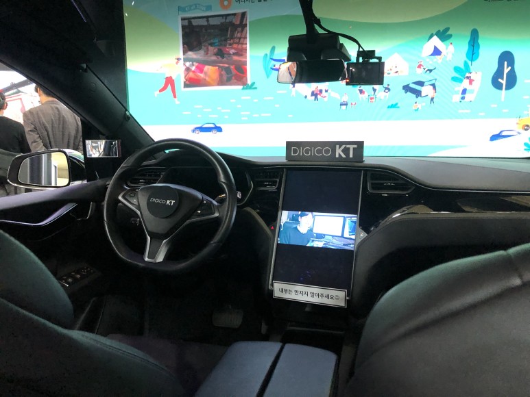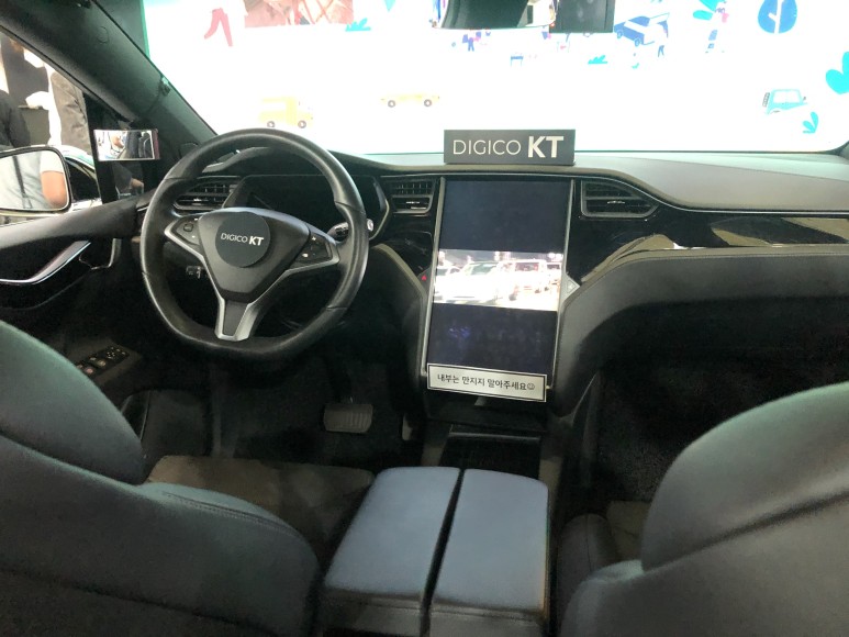 스티어링 휠에 KT 로고를 붙여놨어KT를 홍보하기 위해 테슬라를 끈 듯한 느낌이 드는 것은 기분 탓일까.