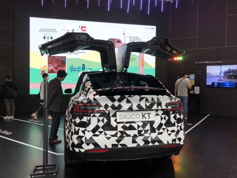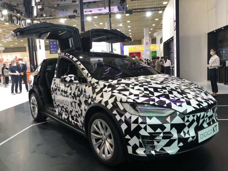 위장막처럼 화려한 무늬로 장식한 테슬라 모델X는 KT가 올해 포지셔닝하려는 디지털의 방향을 보여주는 느낌이었다.우리 KT도 테슬라처럼 디지털 컴퍼니가 될거야. (맞아!) 이런 느낌