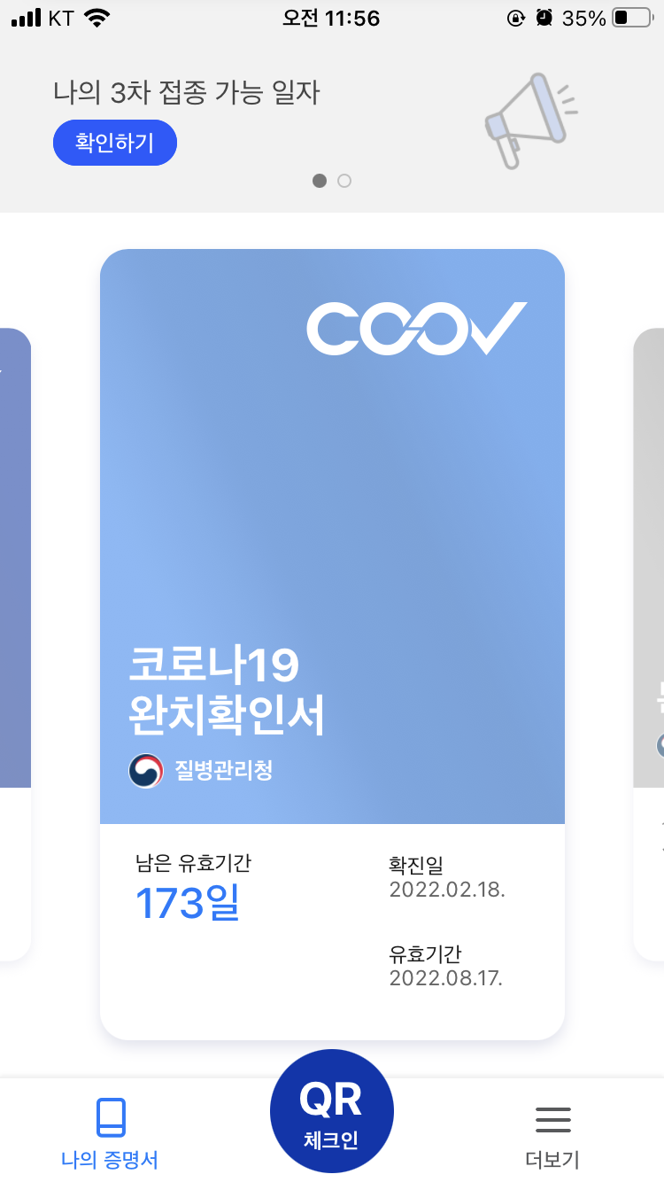 그리고 나서 나온 완치 패스!! 격리일은 검체 채취일 당일이 1일로 계산되는데, 나의 경우는 PCR 재검사를 받고 재검사를 받은 날을 기준으로 격리를 시작했다.그러나 완치 패스를 확인해 보면 최초 검사일을 기준으로 발급되고 있다.(채취일 다음날은 확정일)