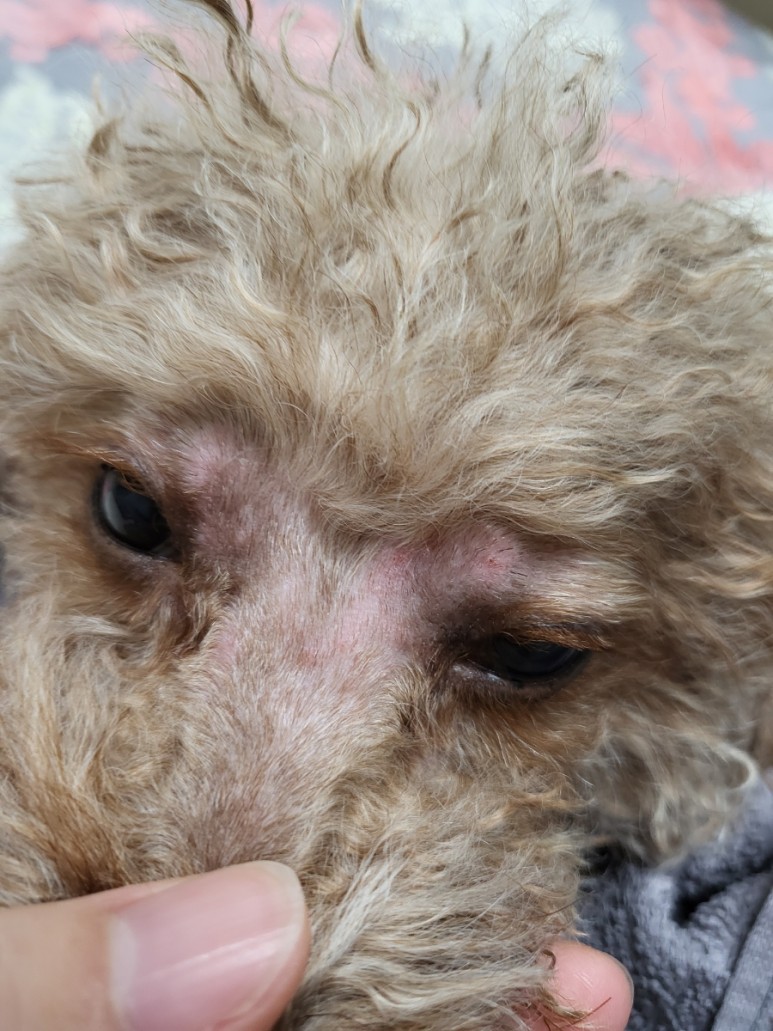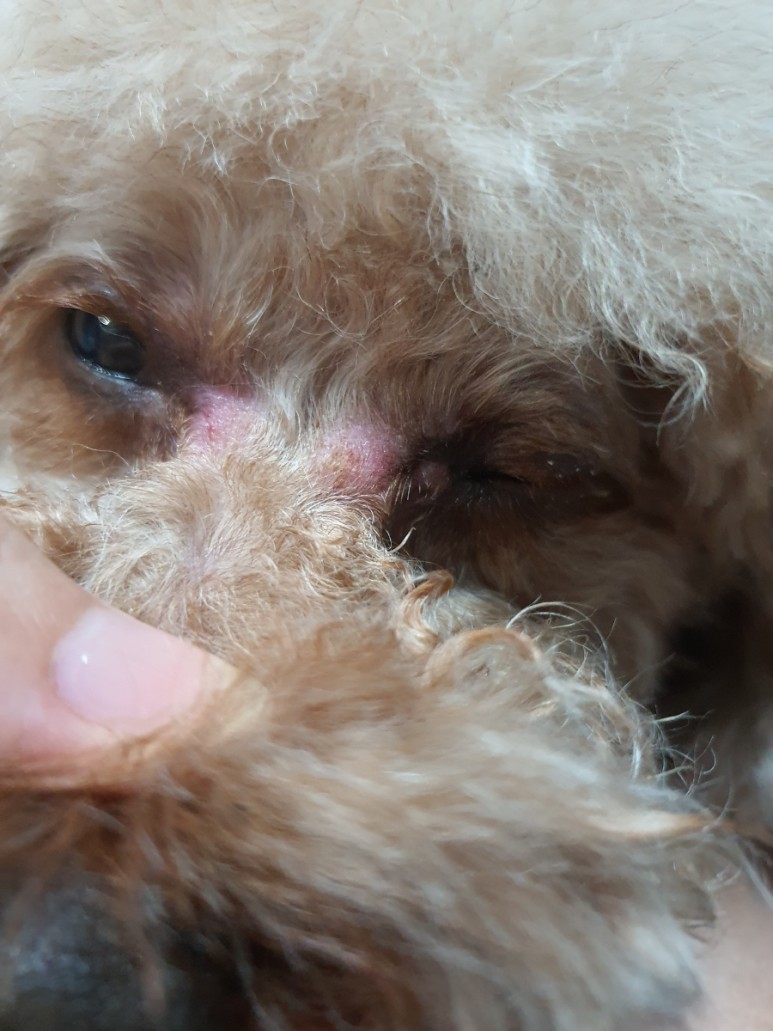 자꾸 안약을 넣으니까 피부에 발진이 생긴다.눈 주위의 털을 잘 관리해야 한다.조금만 소홀히 해도 눈 주위에 이렇게 돼.