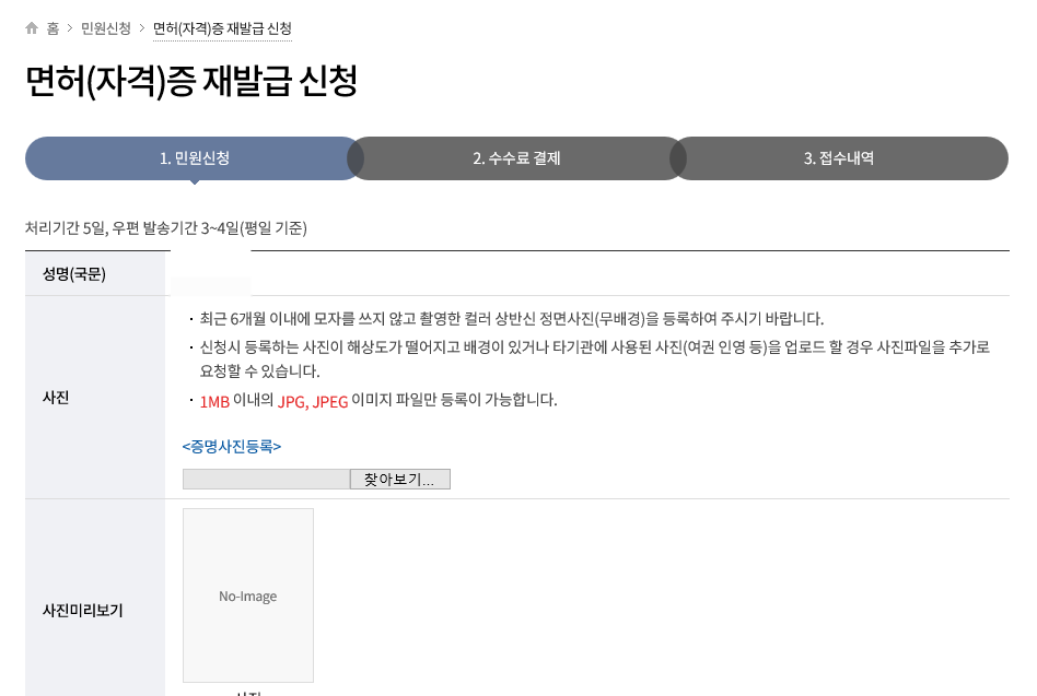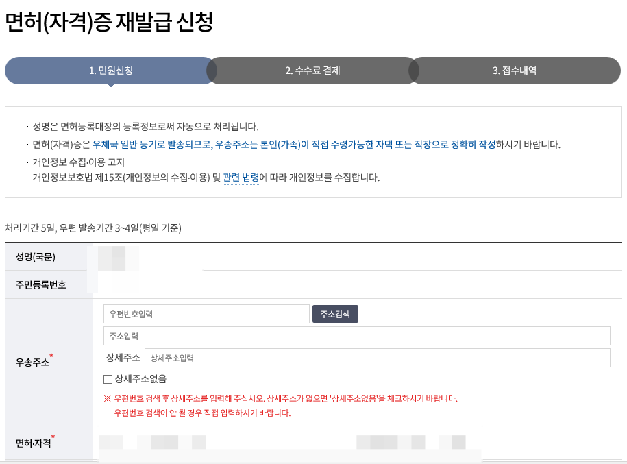 그 후에 민원을 신청하게 되는데 제 이름과 주민등록번호, 면허자격증 등은 제가 입력하지 않아도 확인할 수 있게 되어 있어요.
