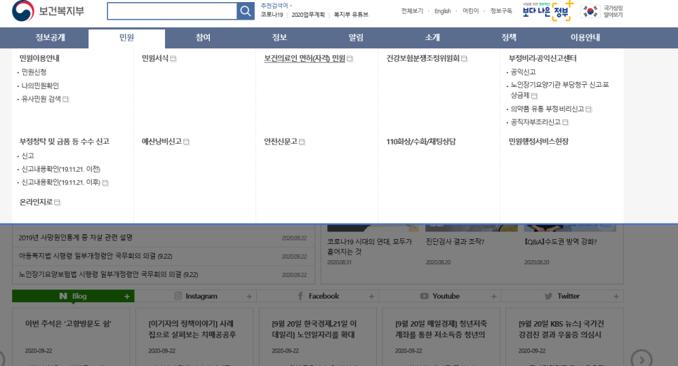 먼저 인터넷 검색창에 보건복지부 사이트 검색 -> 클릭 홈페이지에 들어가면 위쪽에 민원 버튼이 보입니다.